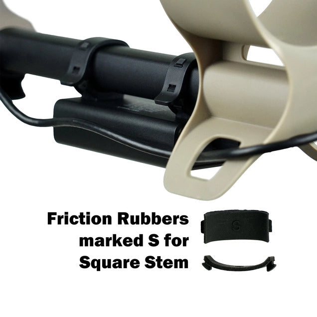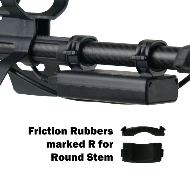 *Has been tried on Quest machines with a round stem, Eg: X5, X10. On the latest Nokta's: Legend, Simplex, Score, FindX; it will go in the trapezoid stem in front of the control box using the round rubber adaptors, but the fit is not as firm as with a round stem and may require additional packing.
